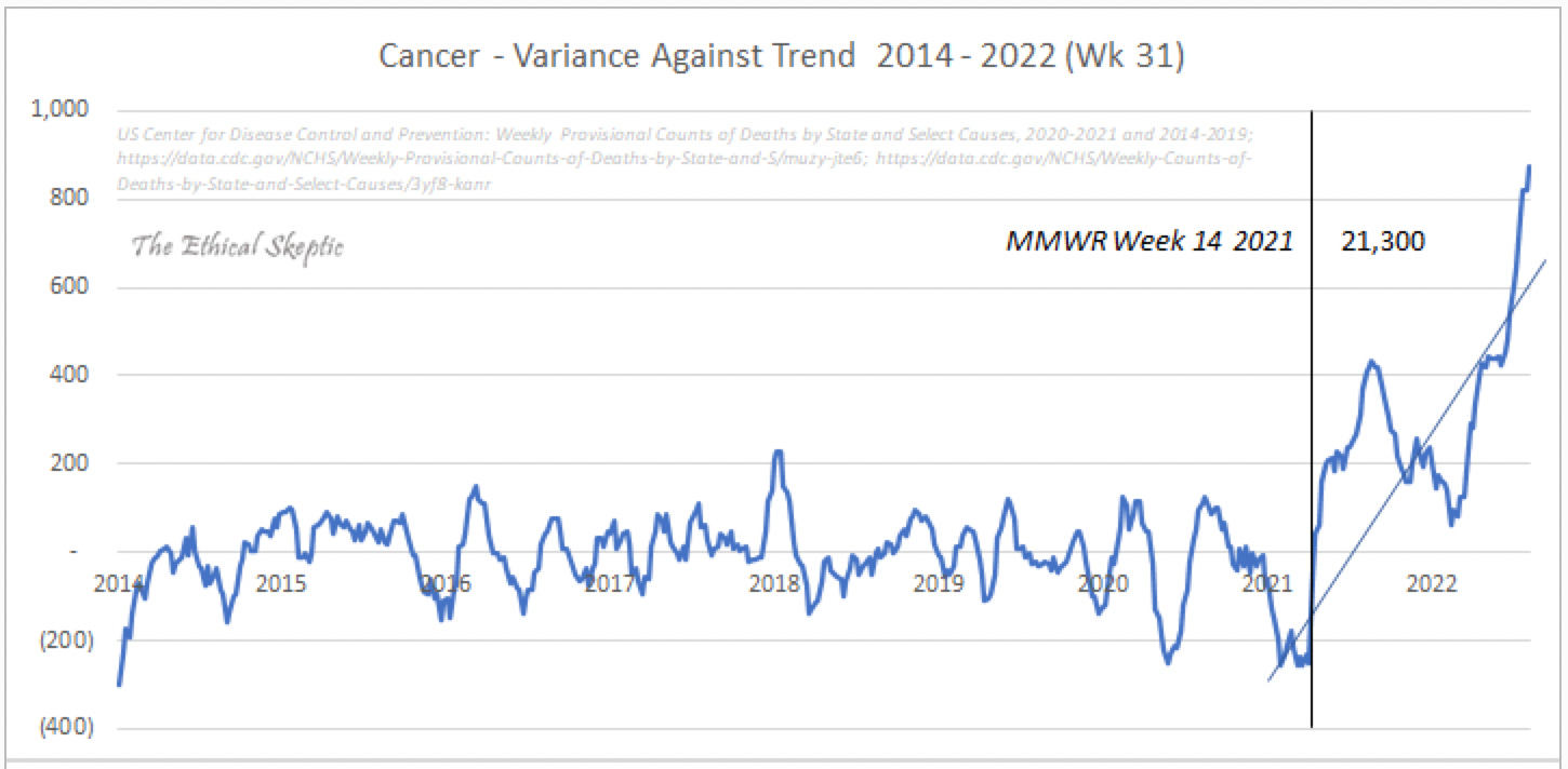 For a little Team Reality moment, Ethical Skeptic has been ringing the cancer alarm bell for months. Here’s his latest chart, using CDC data:
