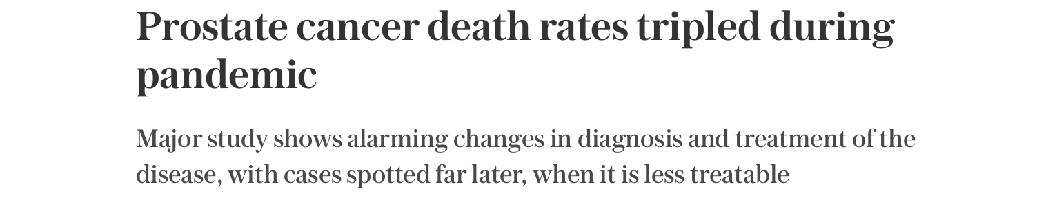 Gosh. The Telegraph says that, according to “extremely worrying” new data, death rates among men with prostate cancer tripled during the covid pandemic. The paper spends most of its time speculating that the increase must be due to deferred treatments and hospital backlogs.
