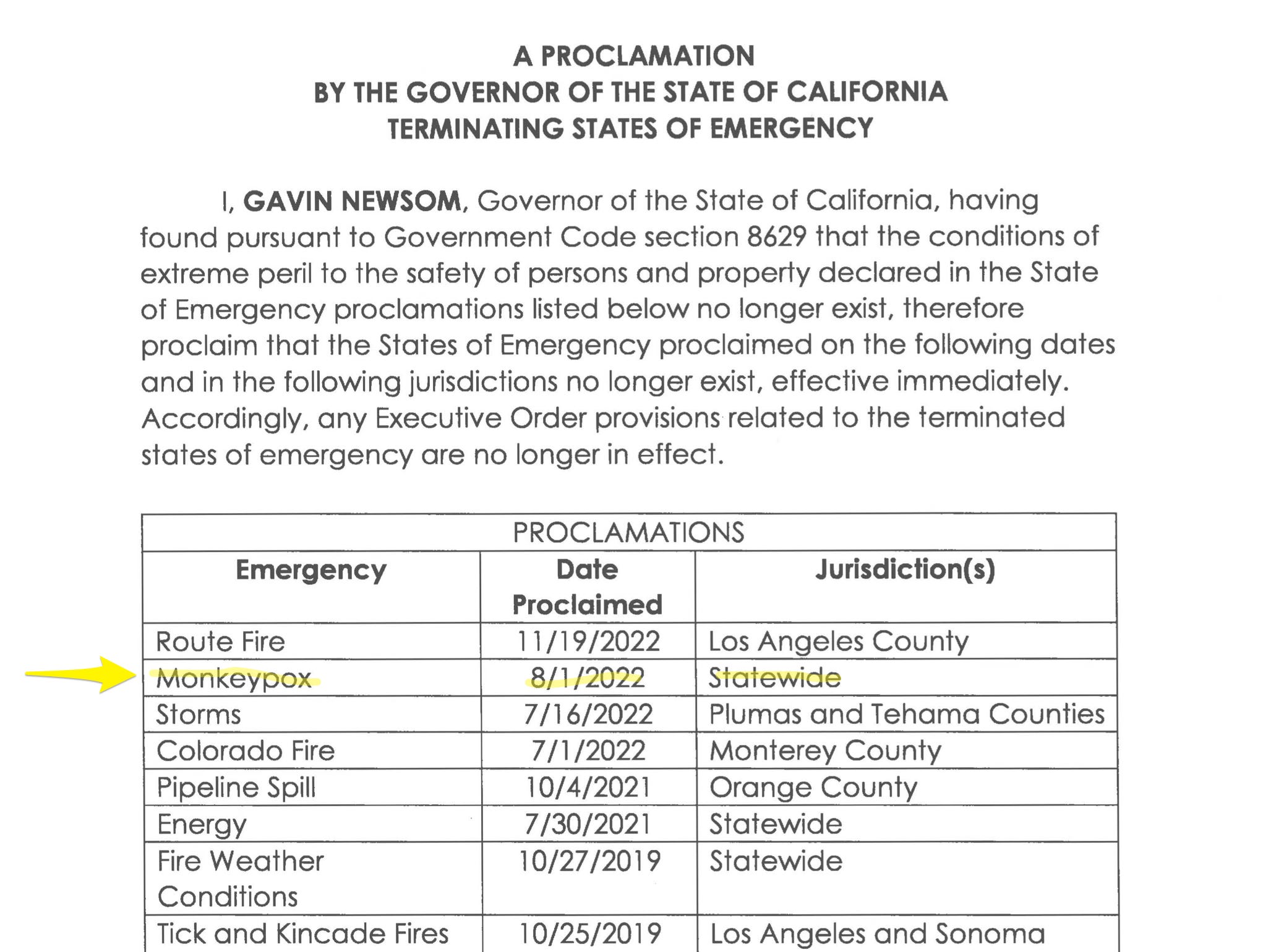Monkeypox! And look, the poor “Route Fire” only got a few months to live, sacrificed so festival-virus Monkeypox wouldn’t have to stand out at the top of the list. Newsom wanted to jettison the not-so-popular Monkeypox state of emergency but was too scared of angry gay activists to just do it directly, so the coiffed poltroon scraped up 25 other states of emergency to make it seem like he was just doing spring cleaning or something.