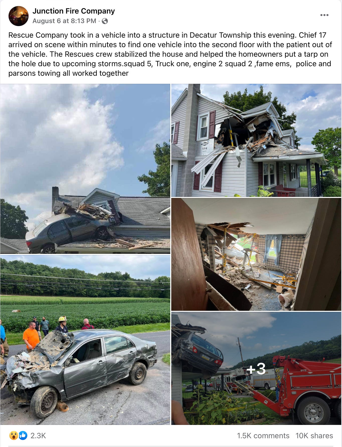 On Sunday, firefighters responded to a one-car crash at a home in Lewistown, Pennsylvania, and found a 2006 gray sedan jutting into a dormer window and stuck on the mangled roof. Only the driver, Evan Miller, 20, was injured. The homeowners expressed a degree of surprise.