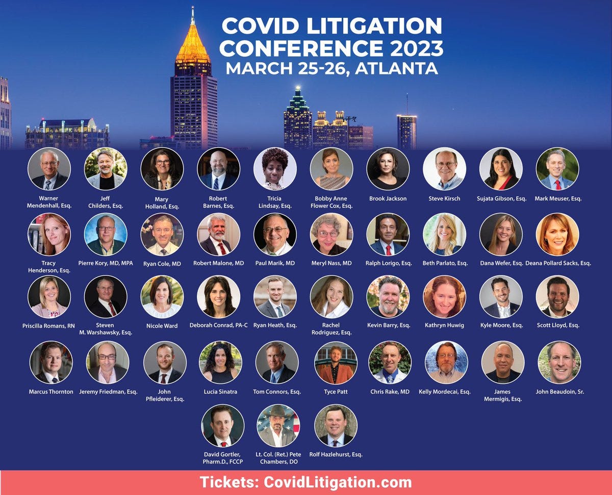 🪖 In just a few more days I’ll appear at the Covid Litigation Conference in Atlanta, where I will deliver the Keynote first thing Saturday morning and will then lead a panel on defending doctors from licensing challenges in the afternoon. The all-star lineup is going to be terrific.