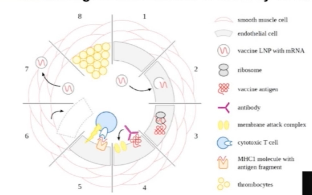 In phase 1 below (at the 1 o’clock position), the endothelium is normal, smooth, un-transfected. In phase 2, an LNP particle sticks to a cell in the vessel lining and delivers its mRNA package into that cell. In phase 3, the cell starts pushing out spike, which is where the problem starts.