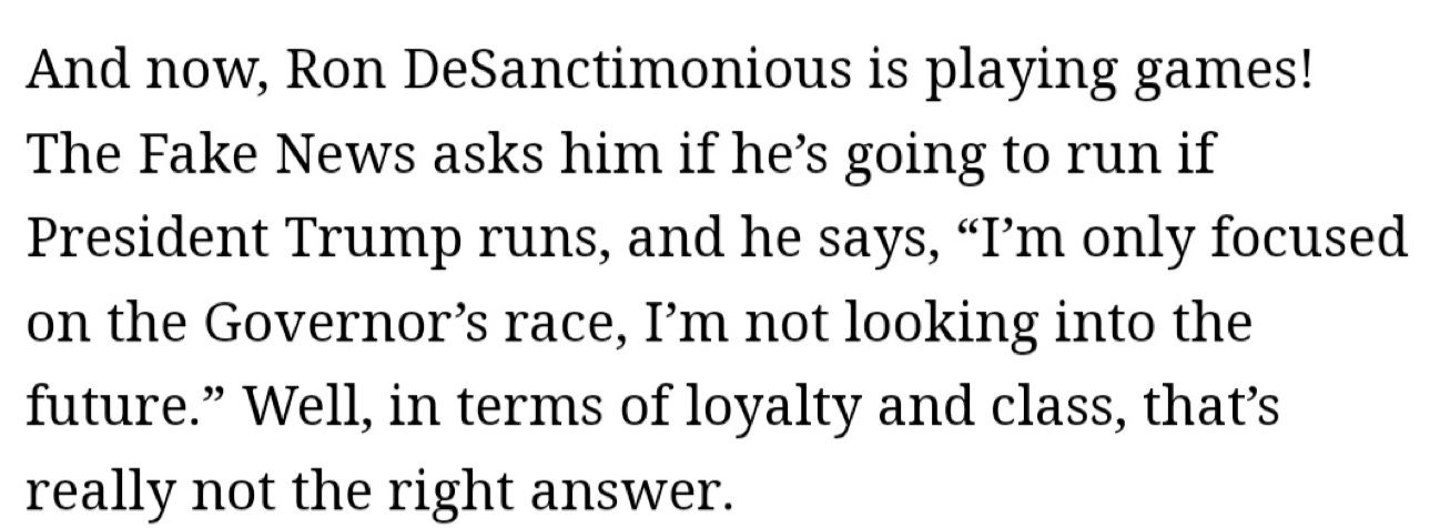 The next day, Trump posted a series of inflammatory comments about how he’d helped Governor DeSantis win his election, and said this: