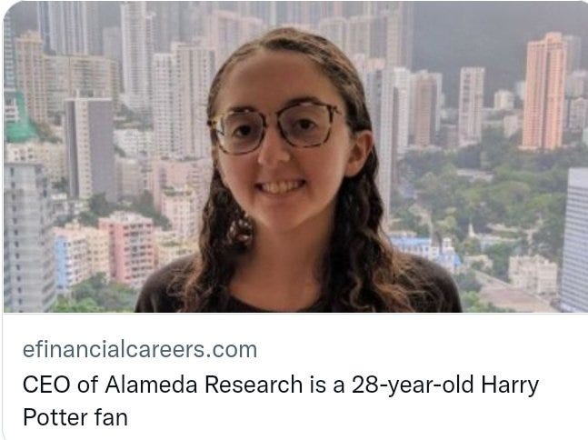 Apparently raising no red flags at all, Sam staffed his skyrocketing companies with friends and paramours. For example, the “next Warren Buffet” hired a nerdy 28-year-old and co-girlfriend to run FTX’s investment arm, Alameda Research. At least she’s read a book.