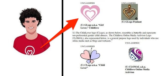 Maybe it’s just a coincidence. But also coincidentally, Sam’s self-selected avatar’s t-shirt features a double-heart shaped image that ALSO resembles a known pedophilic symbol: