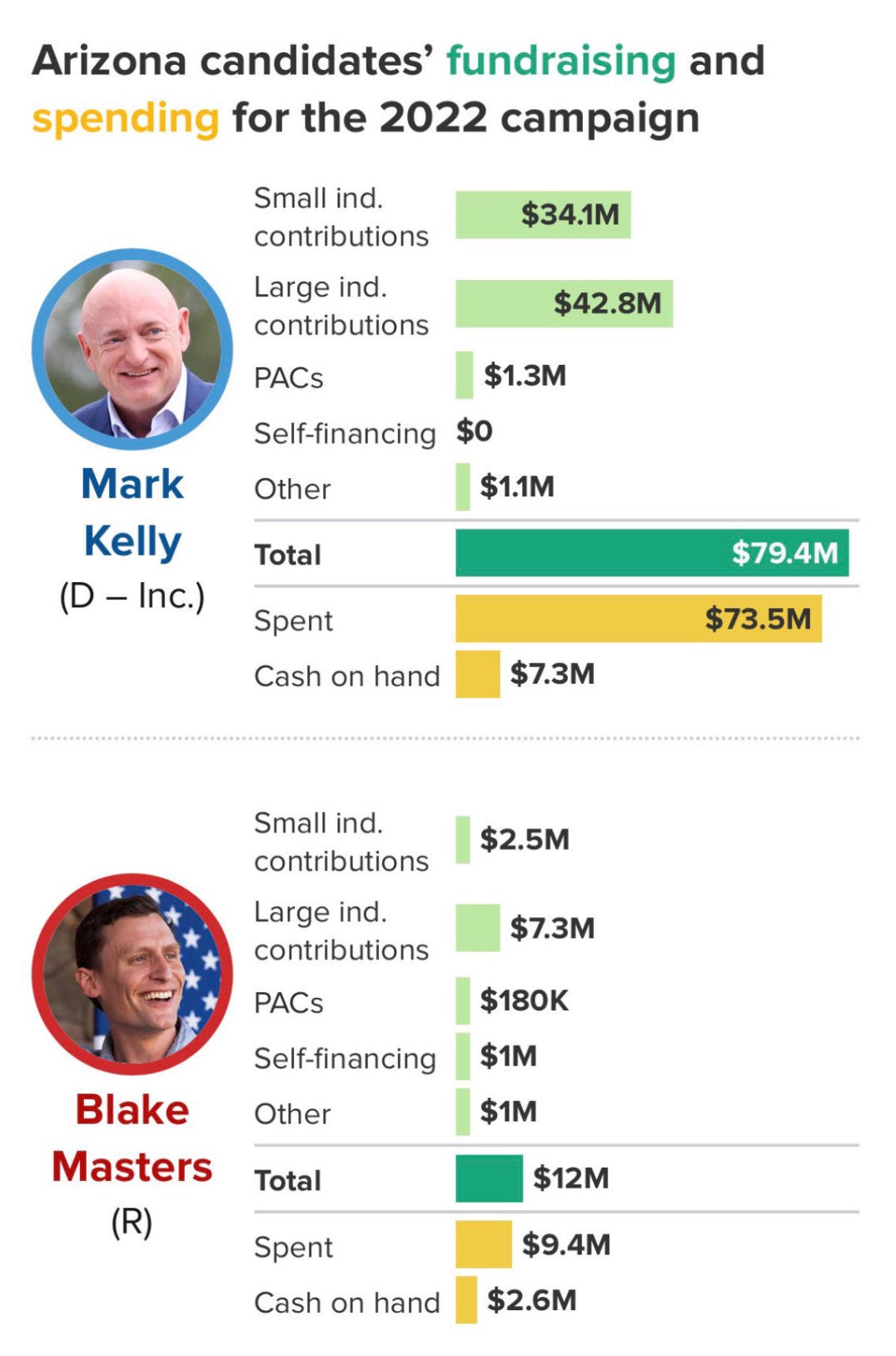 🔥 As I noted yesterday, Democrats have, somehow, vastly outraised Republicans. For example, Blake Masters only spent $9.4M on his senatorial race, compared to Mark Kelly, who spent an astounding $73.5M.