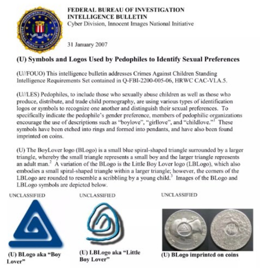 Notice the pizza-slice-shaped figure in the middle? So have a lot of Anon folks, who learned a few years ago that the wound-up triangle shape resembles notorious pedophile imagery.