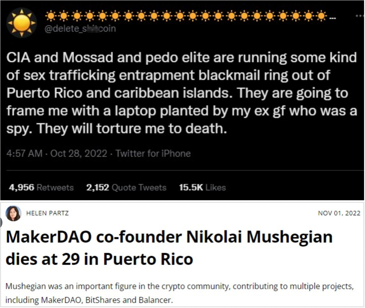 And some folks are wondering about this next story, which broke about a week before FTX’s implosion. The founder of one of FTX’s competitors died suddenly and unexpectedly, right after darkly tweeting about a CIA-run pedophile entrapment ring being run out of the “Caribbean islands.”