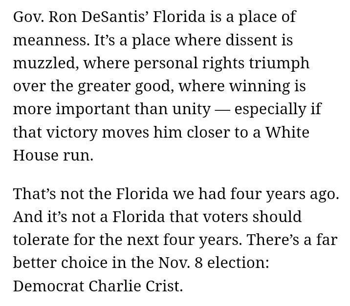 The editors’ unintentionally hilarious rationale for supporting walking scarecrow Crist was not based on his merit, but on Governor DeSantis’ horrifying preference for individual rights: