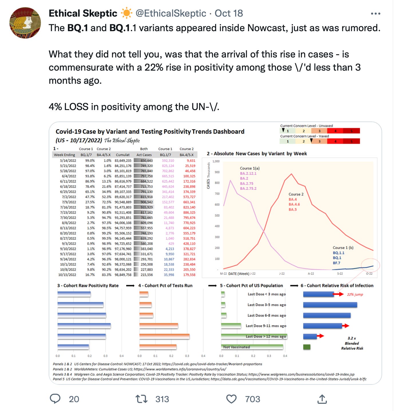A few days ago, covid statistics miner Ethical Skeptic reported that the two new variants producing the most interest lately, BQ.1 and BQ.1.1, appear to prefer RECENTLY jabbed people, if you can believe that. The data suggests jabbed people are +22% more likely to be infected with one of the new variants, while unjabbed folks are -4% likely to catch it.