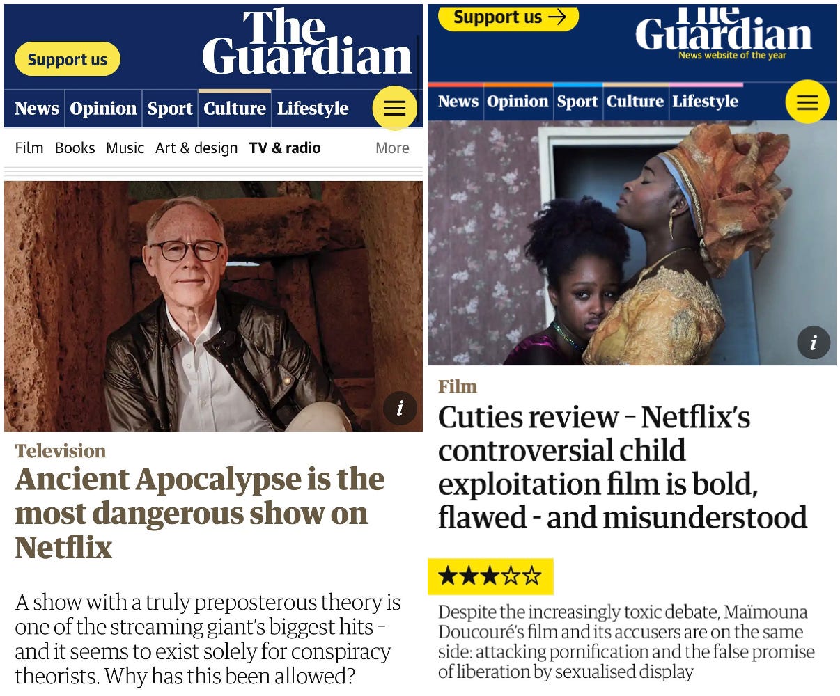 Remember, this is the same Guardian that not too long ago published a glowing review of the pedophilic movie “Cuties.” So it takes a LOT for the Guardian to find a show is “dangerous.” In other words, the Guardian can find something to like and defend even in a movie bursting with pedophilic imagery, but a series about archeological digs is just too much.