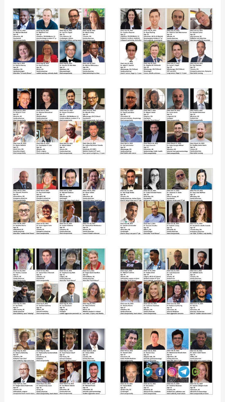 Our preliminary analysis of this extensive data suggests that Canadian doctor deaths under age 50 in 2022 will be 2‐fold higher compared to the 2019‐2020 average. Shockingly, Canadian doctor deaths under age 40 are already 5‐fold higher in 2022 compared to the 2019‐2020 average, and Canadian doctor deaths under age 30 are 8‐fold higher!
