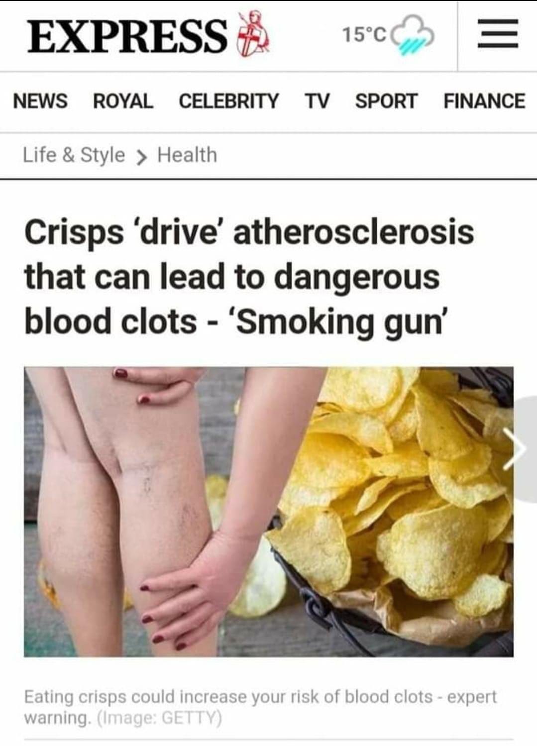🔥 The UK Express helped muddy the waters again, adding to the cacophony of nonsense helping hide big pharma’s liability for its products’ harms, by identifying POTATO CHIPS as the latest culprit causing blood clots.