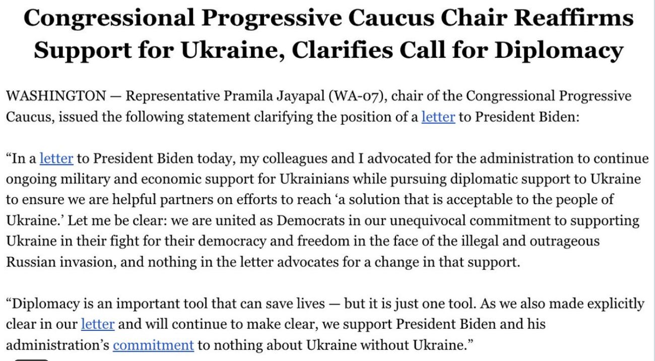 Anyway, within a few hours, the Progressive Caucus was forced to issue a “clarification” emphasizing their support for Ukraine. They must have calculated that they’d gotten a bit over their skis.
