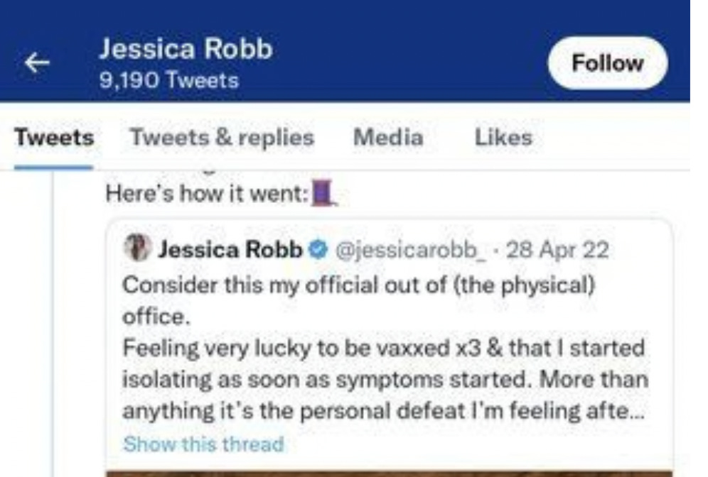 Of course, the Internet is forever, and quick-acting folks had already screenshotted Jessica’s Twitter thread discussing catching covid again after feeling lucky to have her three (3) shots, back in late April, back when she didn’t mind sharing her medical information: