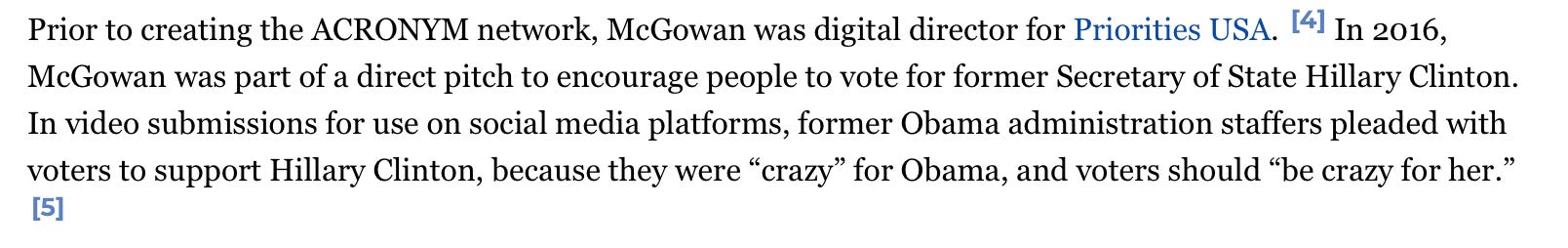 Another “advisor” listed on the GIF’s website is Dan Pfieffer, who used to be Obama’s White House Communications Director. The website identifies a woman named Tara McGowan as the “founder” of GIF. InfluenceWatch describes McGowan as “a Democratic political operative,” and says this about her: