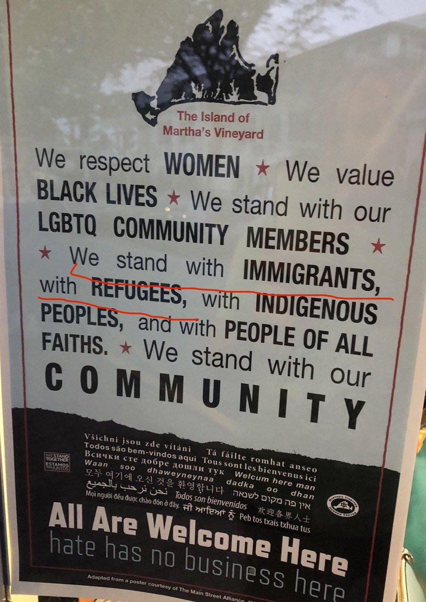 The activation of Massachusetts’ military against these poor defenseless immigrants had some folks scratching their heads, puzzled about the ubiquitous signs previously wallpapering Martha’s Vineyard’s sandy shores, which declare virtuous-sounding ideals like, “hate has no business here” and “todos son bienvenidos” (“all are welcome HERE”).