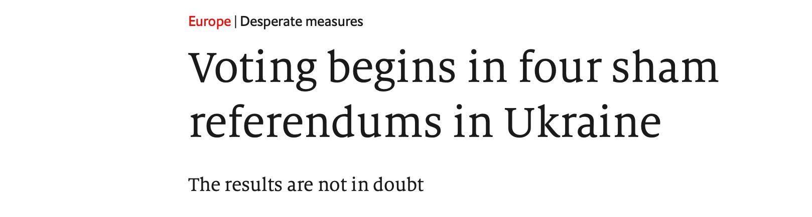 🚀 Russia is already holding referendums in the occupied territories of Ukraine, which make up about 20% of the country. There are only two boxes on each ballot: a box to join Russia and a box to remain in Ukraine. Depending on which ‘side’ you are on, the referendum is either a shining example of democratic self-determination, or it’s a disgusting travesty of a sham election. In fact, the Economist’s story about the referendum this morning even has the word ‘sham’ right in the headline:
