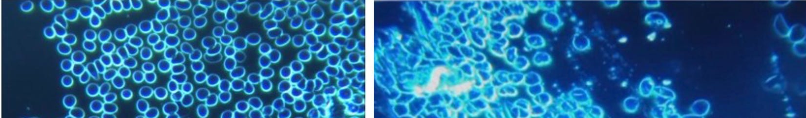 The right side image shows the same person’s blood one month after the first dose of Pfizer mRNA ‘vaccine’. Particles can be seen among the red blood cells which are strongly conglobated around the exogenous particles; the agglomeration is believed to reflect a reduction in zeta potential adversely affecting the normal colloidal distribution of erythrocytes as seen at the left. The red blood cells at the right are no longer spherical and are clumping as in coagulation and clotting.