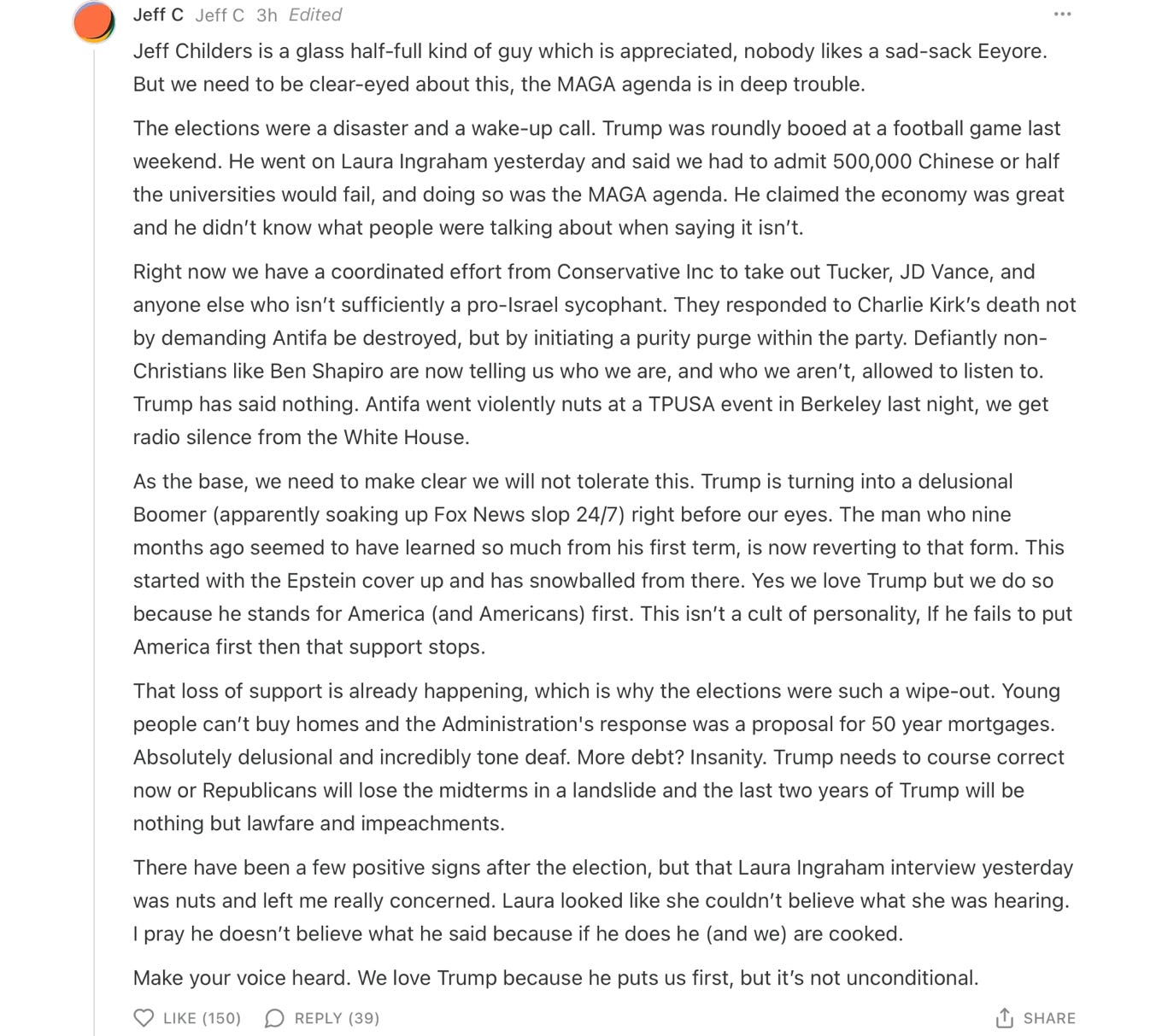⛑️ JeffC’s comment wasn’t wrong. He accurately rounded up this week’s media complaints about the President and wrapped them in a deeper fear; a fear of the moronic affordability crisis narrative, which seems to be ‘working,’ as purportedly evidenced by last Tuesday’s election results. JeffC channeled a vein of disquiet running straight through MAGA. He’s not alone.