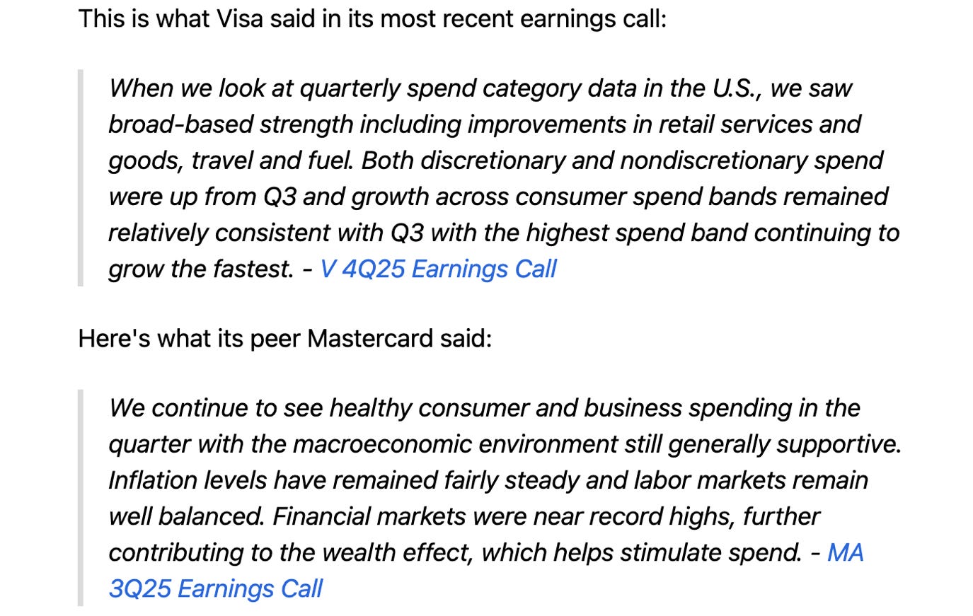Last week, both Visa and Mastercard, which each process hundreds of billions of annual transactions, told investors they saw no sign of any consumer pullback, which they would expect if consumers really smelled a Great Depression coming: