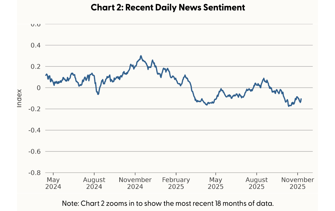 The San Francisco Federal Reserve compiles a “Daily News Sentiment Index,” which tallies negative words used in media headlines about the economy. Here’s the current chart, as of November 3rd. Notice anything?