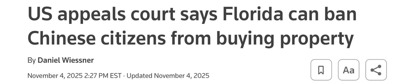 Also last week, the Eleventh Circuit upheld as constitutional a Florida law banning Chinese land ownership in the Sunshine State. Reuters, November 4th: