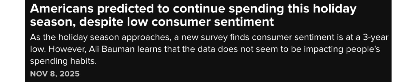 Retailers reported October sales grew about +5% compared to last year. The National Retail Federation forecasts additional holiday sales growth of +3.7%-4.2% over 2024 levels, showing consumers are still spending like it is a great economy. This week, CBS reported that holiday spending predictions are very optimistic, even though consumers sound gloomier than ever in surveys:
