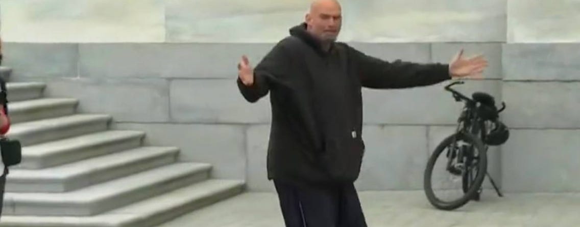 🔥 After two months of inpatient treatment for his “depression” following his “mild stroke” on the Senate floor, Fetterman returned to the Senate Building yesterday dressed in his trademark hoodie, shorts, and sandals: