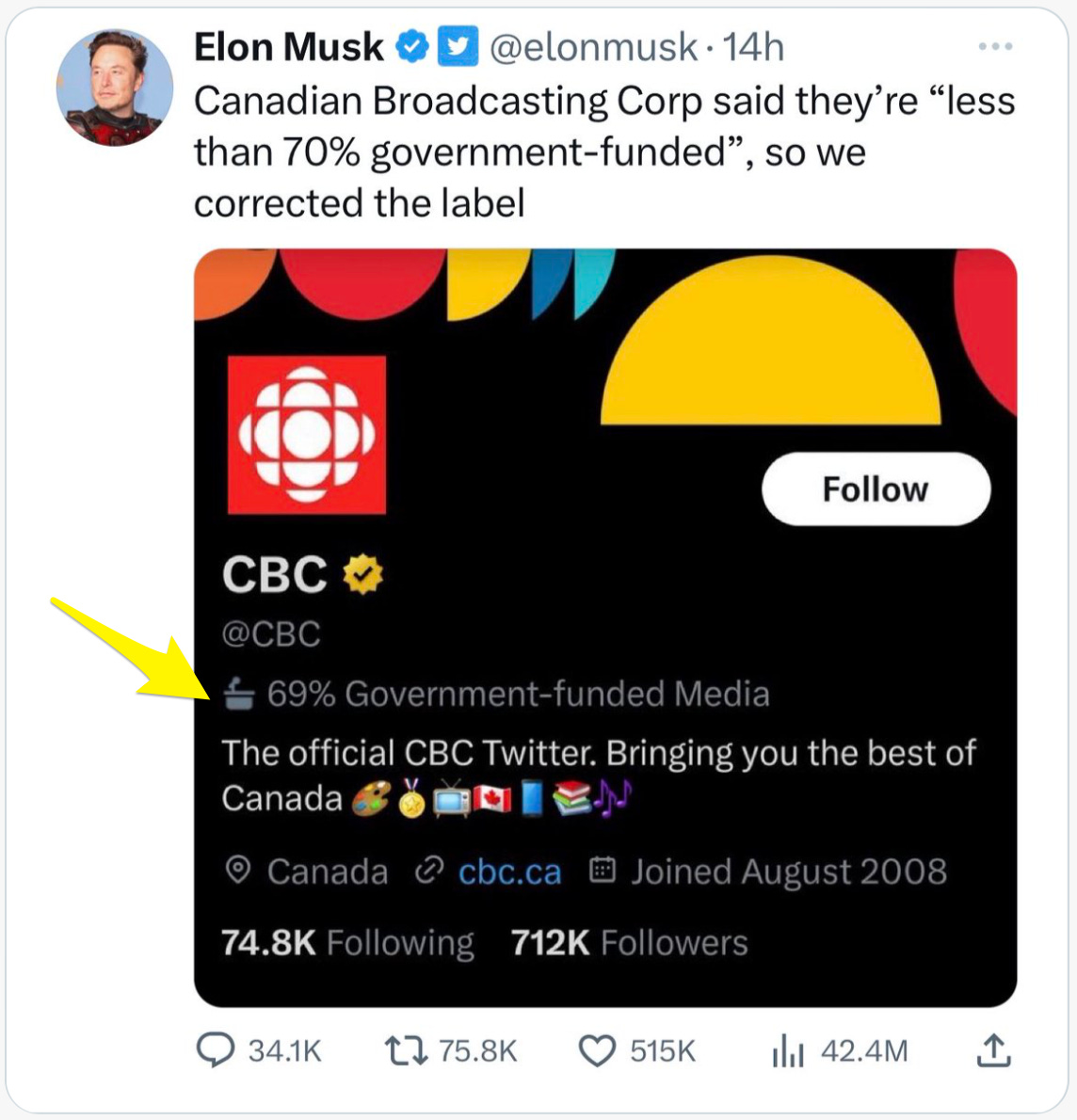 🔥 This one made me laugh out loud. Remember last week’s controversy about Twitter labeling government-funded media accounts like PBS as “government funded?” Well the government-funded Canadian Broadcast Company complained to Twitter, explaining it was “less than 70% government-funded” and demanded a change to its status, and Elon Musk relented, modifying the offensive label for improved accuracy: