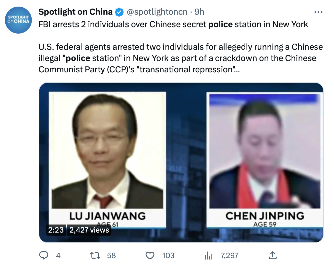 🔥 Totally coincidentally, the DOJ cracked down on a “secret Chinese police station” in New York yesterday. The New York Times ran the story, headlined “F.B.I. Arrests Two on Charges Tied to Chinese Police Outpost in New York.”