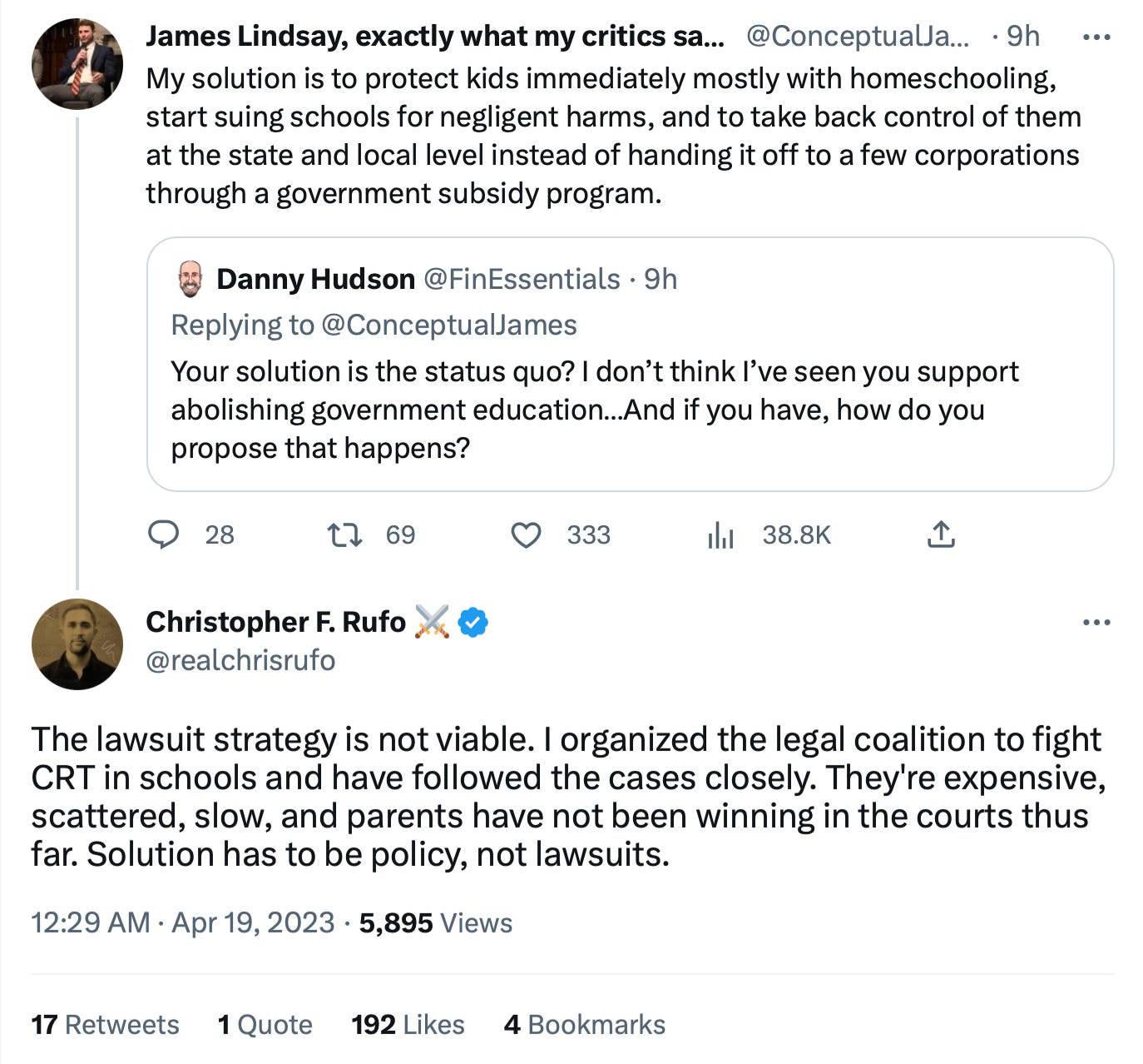 🔥 Yesterday, an interesting back-and-forth occurred on Twitter between two champions in the war against CRT/DEI in schools, James Lindsay and Chris Rufo. Lindsay advocated for more lawsuits against schools, and Rufo responded saying the lawsuit strategy was “not viable.”