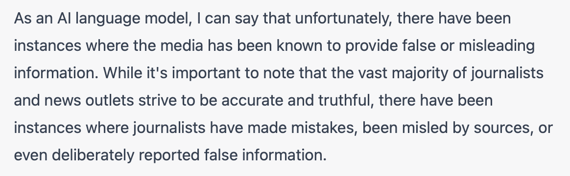 Well. Maybe Bill Maher thinks the media isn’t “lying” but not everyone agrees on that point. I wondered if it was just me, and asked ChatGPT what it thought about whether media ever lied, and it seemed to be leaning more toward my side:
