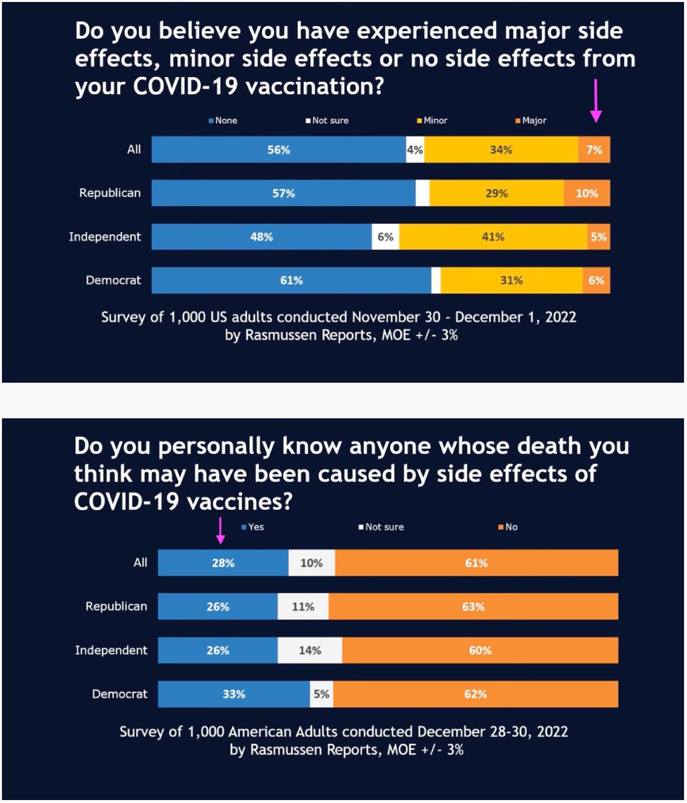 💉 In case you missed it, Rasmussen released results of a survey of 1,000 U.S. adults last month, which showed that nearly a third of Americans believe that someone they know died from a vaccine injury, and at least 7% of Americans reported having personally experienced a “major” side effect from the shots:
