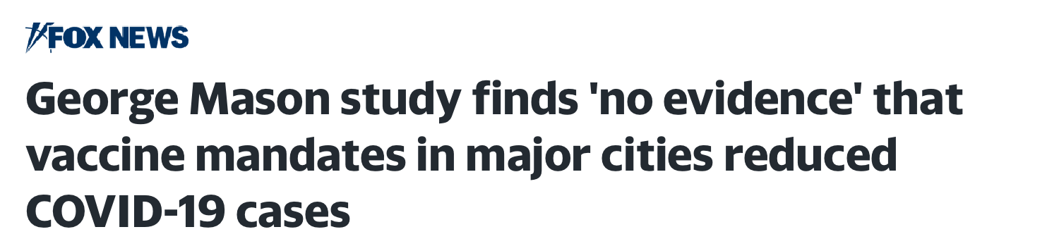 — A George Mason University study compared areas with and without jab mandates, and concluded that the mandates neither increased vaccine uptake nor reduced covid cases. Imagine that. (Well, you can’t honestly say they didn’t do “anything,” since they did trash the economy.)