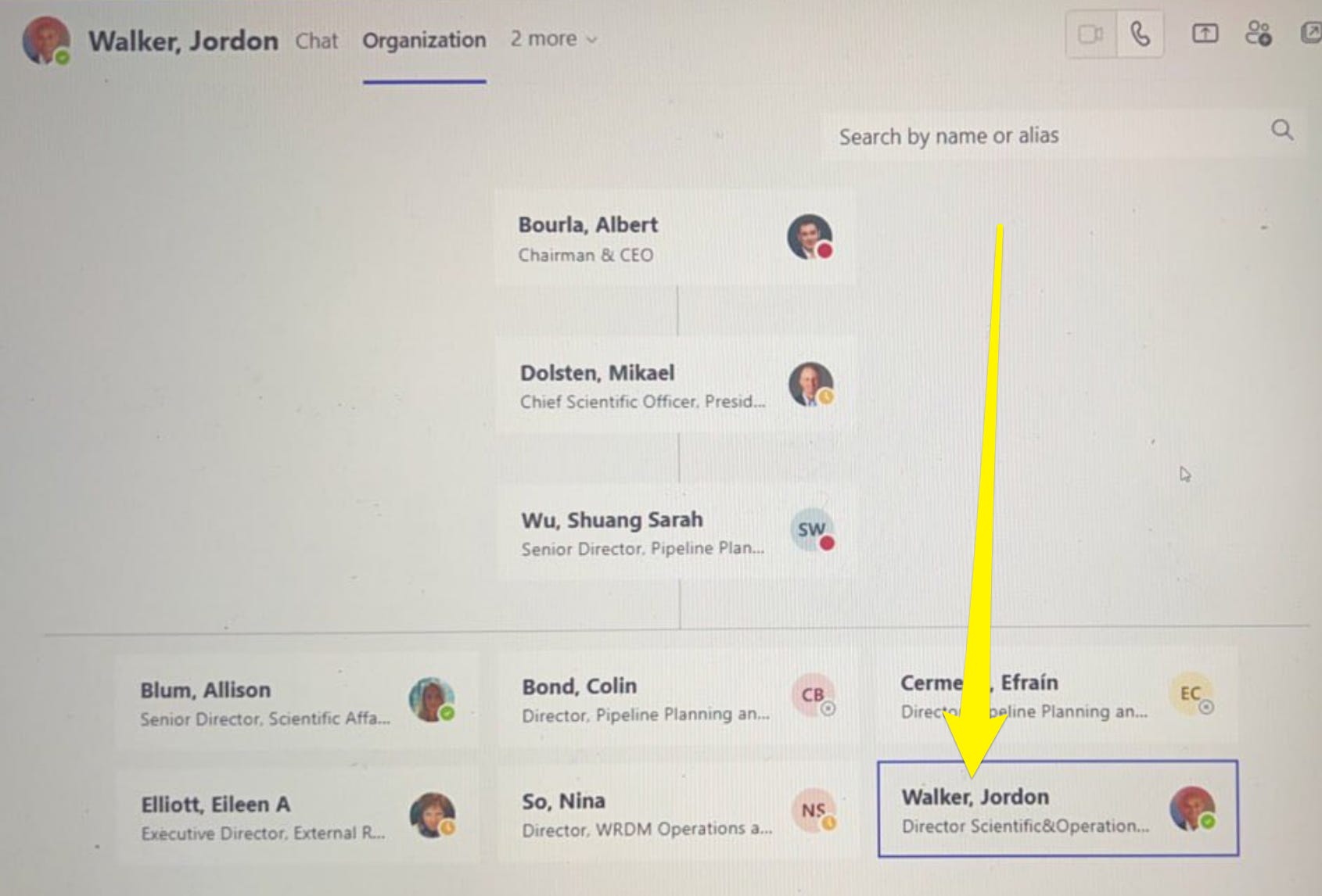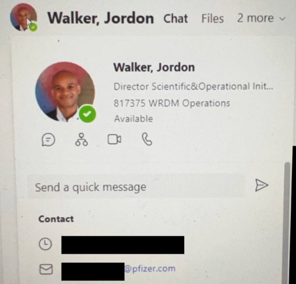 Project Veritas staffers also disclosed a shot purportedly from an internal Pfizer chat application confirming Walker’s face and title: