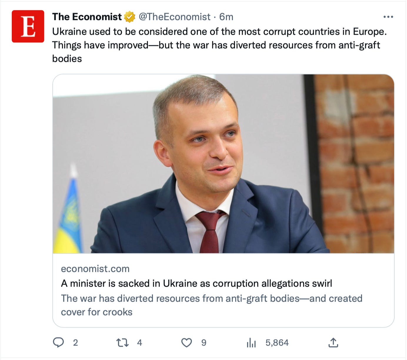 🚀 Good news, everybody! The Economist says that — in one short day — Ukraine’s corruption problem has ALREADY IMPROVED since yesterday’s news that Zelenskyy fired a bunch of useless tokens.
