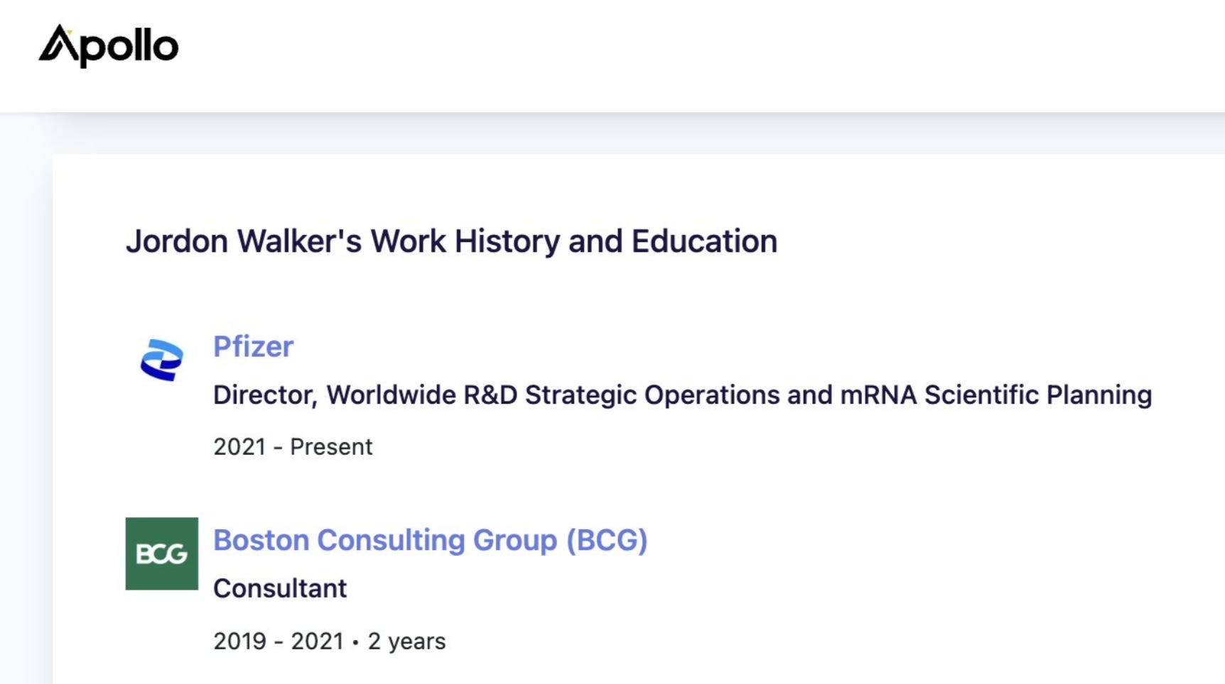 Boston Consulting Group often lends or places professionals with Fortune-100 companies like Pfizer, so that would make sense. Walker’s now-deleted Apollo profile confirms his work for BCG and indicates he started working for Pfizer in 2021: