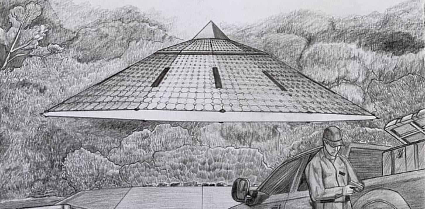 Herrera explained “The craft was rotating in a clockwise motion while changing colors. It had an audible hum to it, like the sound of a transformer or a guitar amp. It was an octagonal shape with a pyramid at the top of it that was black.”