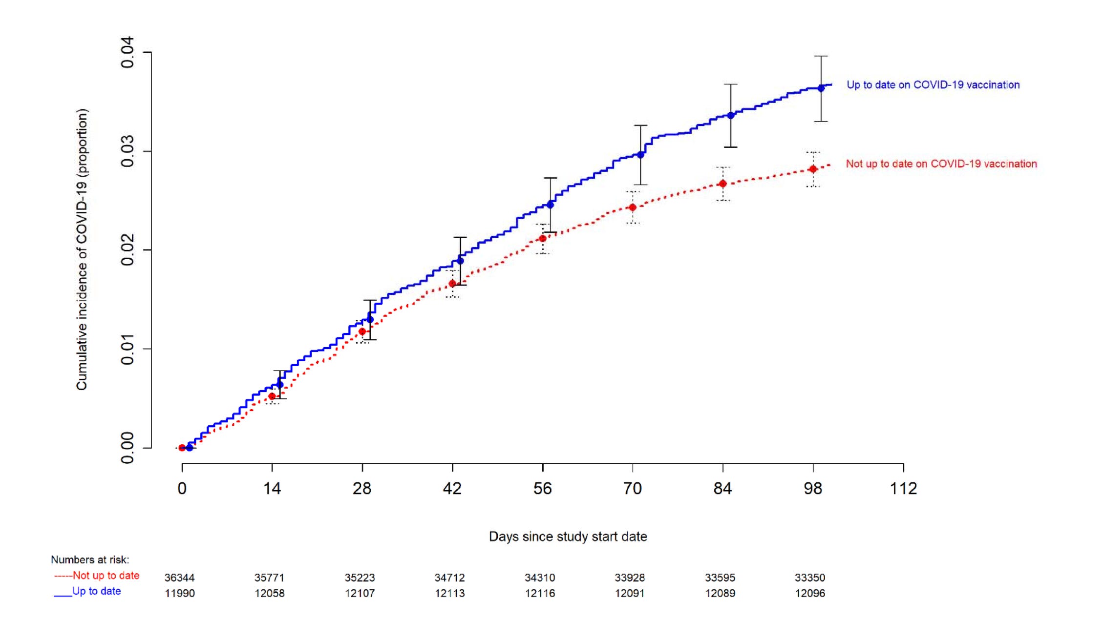 Among 48,344 working-aged Cleveland Clinic employees, those not “up-to-date” on COVID-19 vaccination had a lower risk of COVID-19 than those “up-to-date”.
