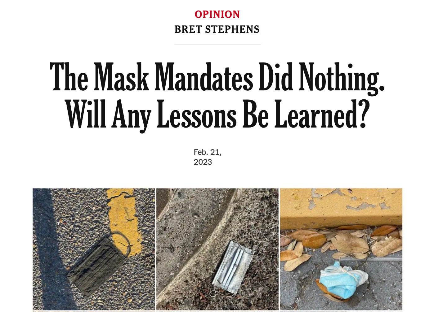 So … that’s right, it’s really over. The author, regular Times columnist Brett Stephens, allowed it’s POSSIBLE that SOME people might be disciplined enough to wear their masks “right” all the time, without ever slipping, even for a second, and so they — the rare good ones — could POSSIBLY see SOME benefit from masking, but for most people it’s a complete and utter waste of time: