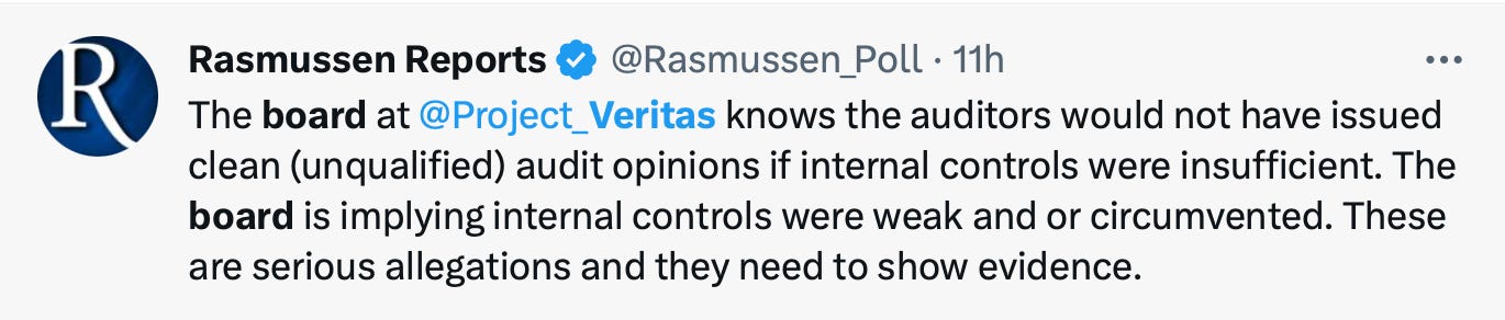 There are actually two great points here. First, the fact that PV was independently audited — and the auditors never complained. So, in trying to score points off James O’Keefe, the Board just publicly accused itself (Project Veritas) of tricking its auditors. Second, the Board’s airing of its public grievances against O’Keefe opened the company up to potential liability, since they are claiming they — the company — have been misusing donor funds.