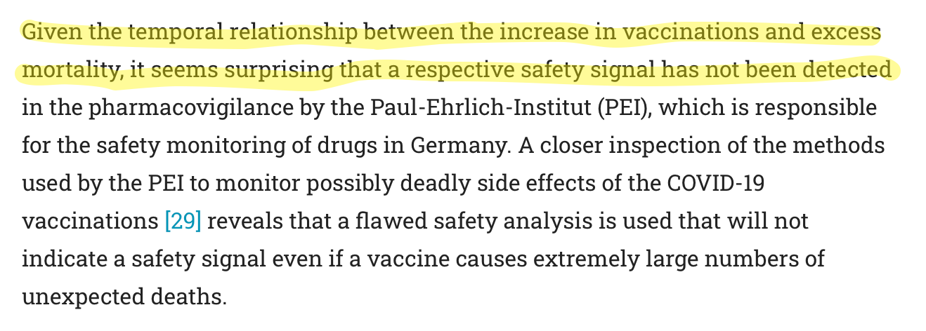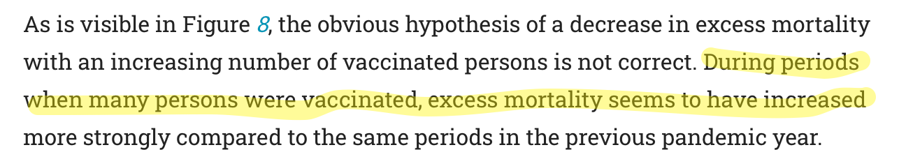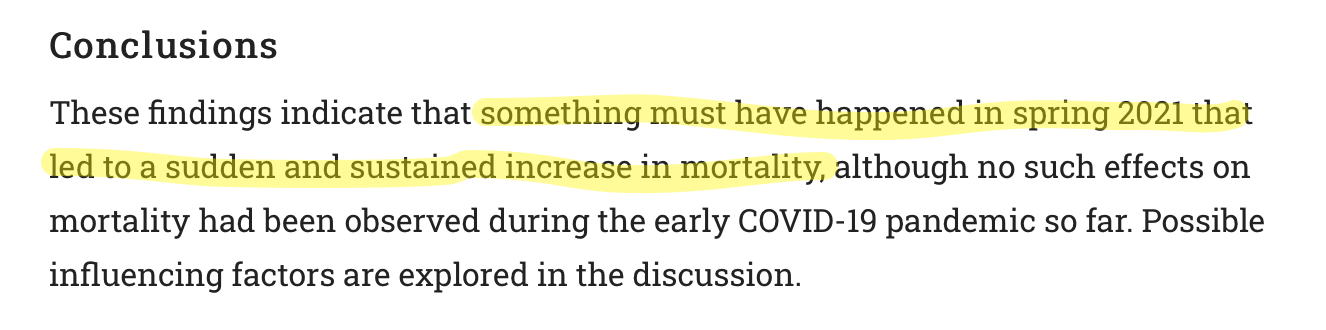 By this point, I was tapping the keyboard in frustration. They already let the mRNA cat out of the drug sack. Why not just come right out and say it? And then, remarkably, they pretty much said it: “During period when many persons were vaccinated, excess mortality seems to have increased.”