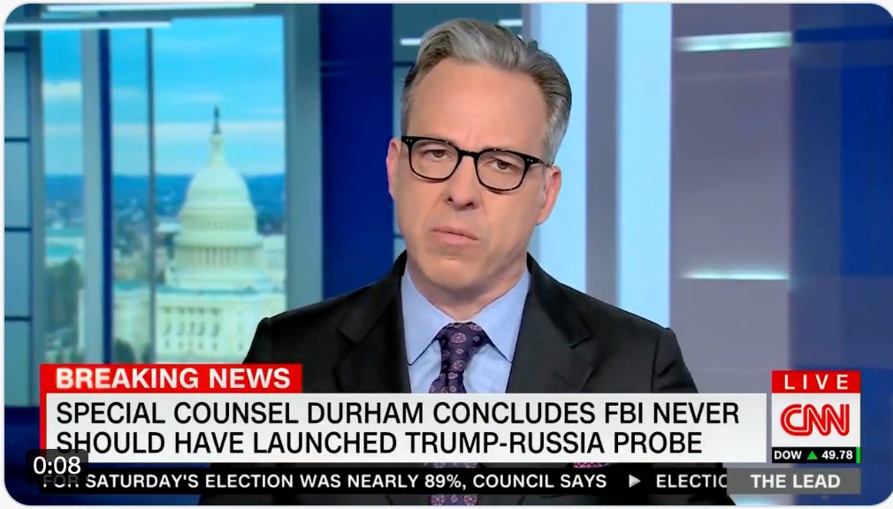 There are hot takes all over the place expressing every possible opinion, but there were signs that even the left realizes the Durham report will be a problem. Yesterday, CNN anchor Jake Tapper surprisingly called Durham’s report “devastating” to the FBI and even grudgingly admitted it exonerates Trump, albeit “to a degree.”