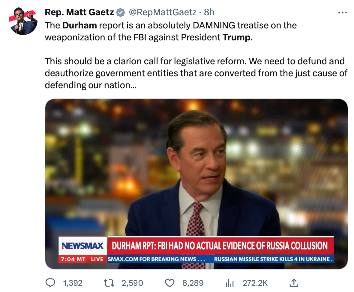 Representative Matt Gates hilariously called the FBI a “disinformation agency,” and vowed the report is “an insufficient consequence:”