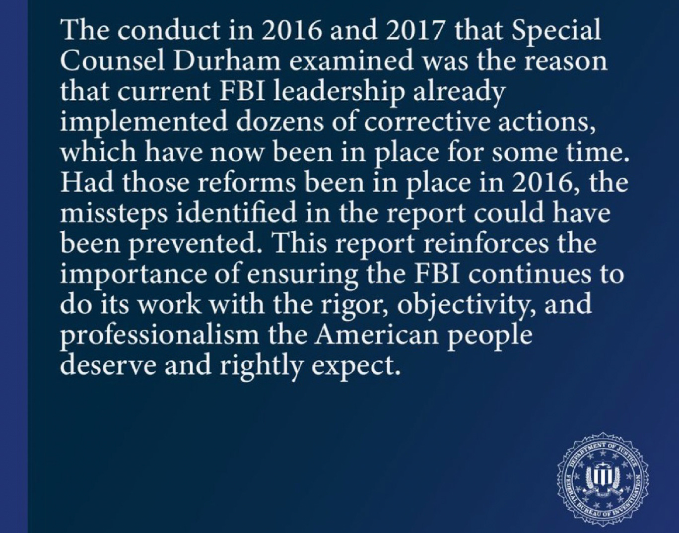 And the FBI, which by all accounts looks predictably terrible in Durham’s report, promptly issued a statement yesterday saying, don’t worry, they already fixed all the problems, you can totally trust them: