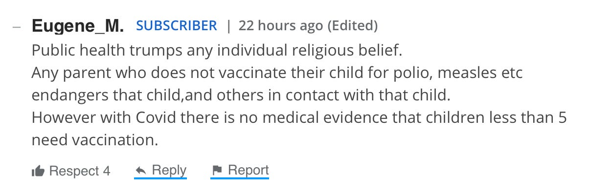 Eugene succinctly stated the problem: “Public health trumps any individual religious belief.” We can speculate about the reasons why, but a good third of the country would happily to hit the eject button on the Constitution’s protection of individual rights, to save the country from a mild virus. That’s even though we’ve somehow managed to survive the last 230 years with those individual rights, and even though we are — allegedly — enjoying the fruits of miraculous developments in medical science.