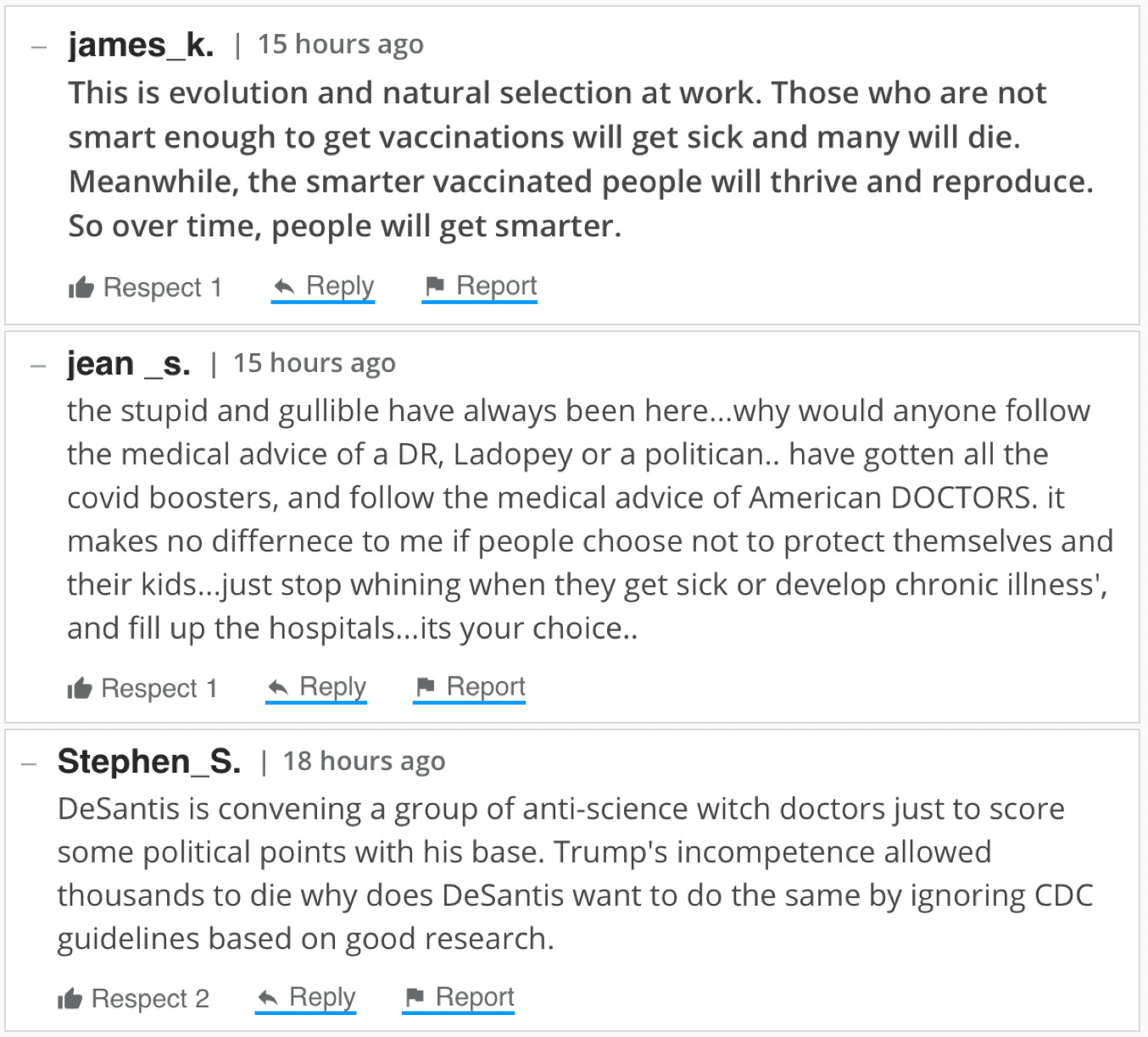 As part of this, DeSantis began calling vaccines “jabs” — as if the slight temporary arm pain was more important to consider than the life-saving immunity. And he refused to talk about his own vaccination status… A byproduct of this suppression of vaccine advocacy and outright cheerleading against vaccinations has been unnecessary deaths.
