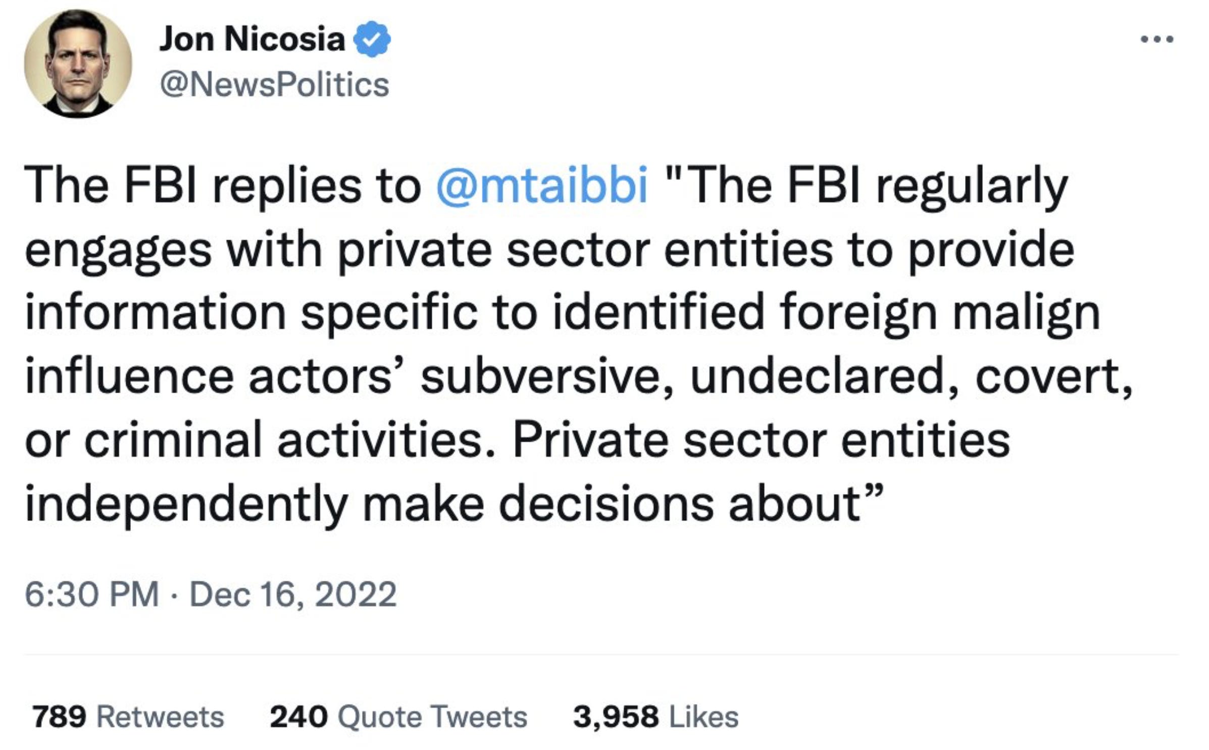 And that’s how it works! On Friday, at the speed of science, the FBI publicly responded to Taibbi’s “supplemental” post, brusquely explaining that it “regularly engages with private sector entities” and whatever those private section entities do with that information is completely “independent” from the FBI’s strong-arming, how dare you.