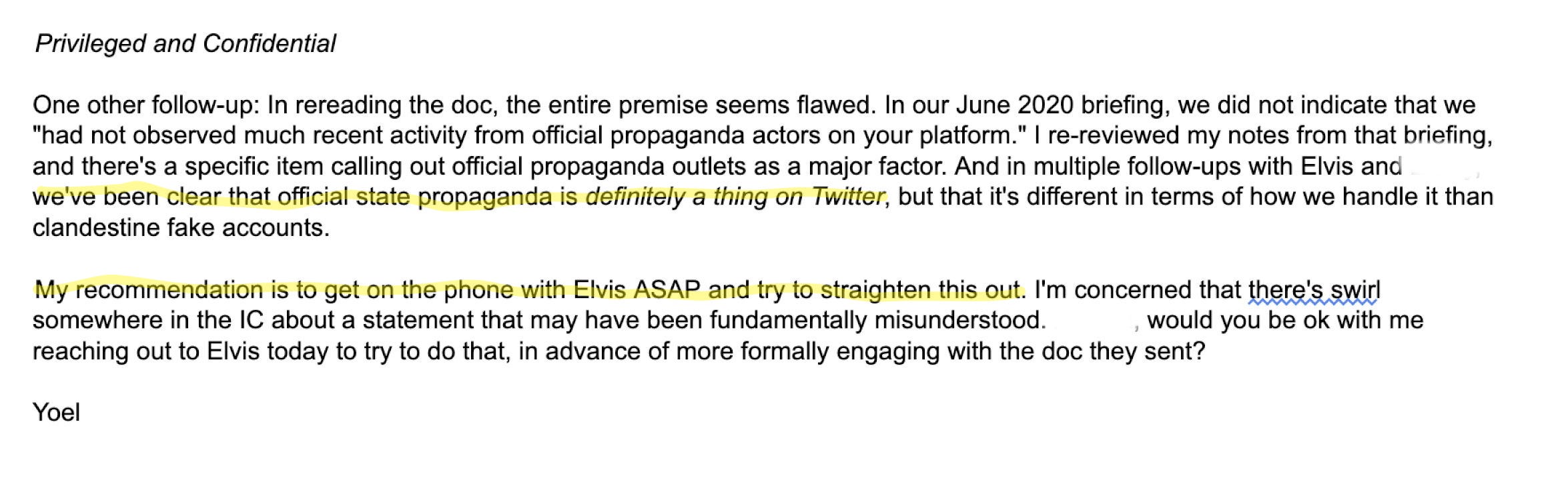 Back to our story. Completely unsurprisingly, in the face of Agent Chan’s strongly-worded letter, Twitter’s former censorship head Yoel Roth orchestrated a complete about-face, and let the “team” know that “we’ve been clear that official state propaganda is DEFINITELY A THING ON TWITTER.” He also referred, not just to his agency, the FBI, but to the “IC” — the “Intelligence Community.”